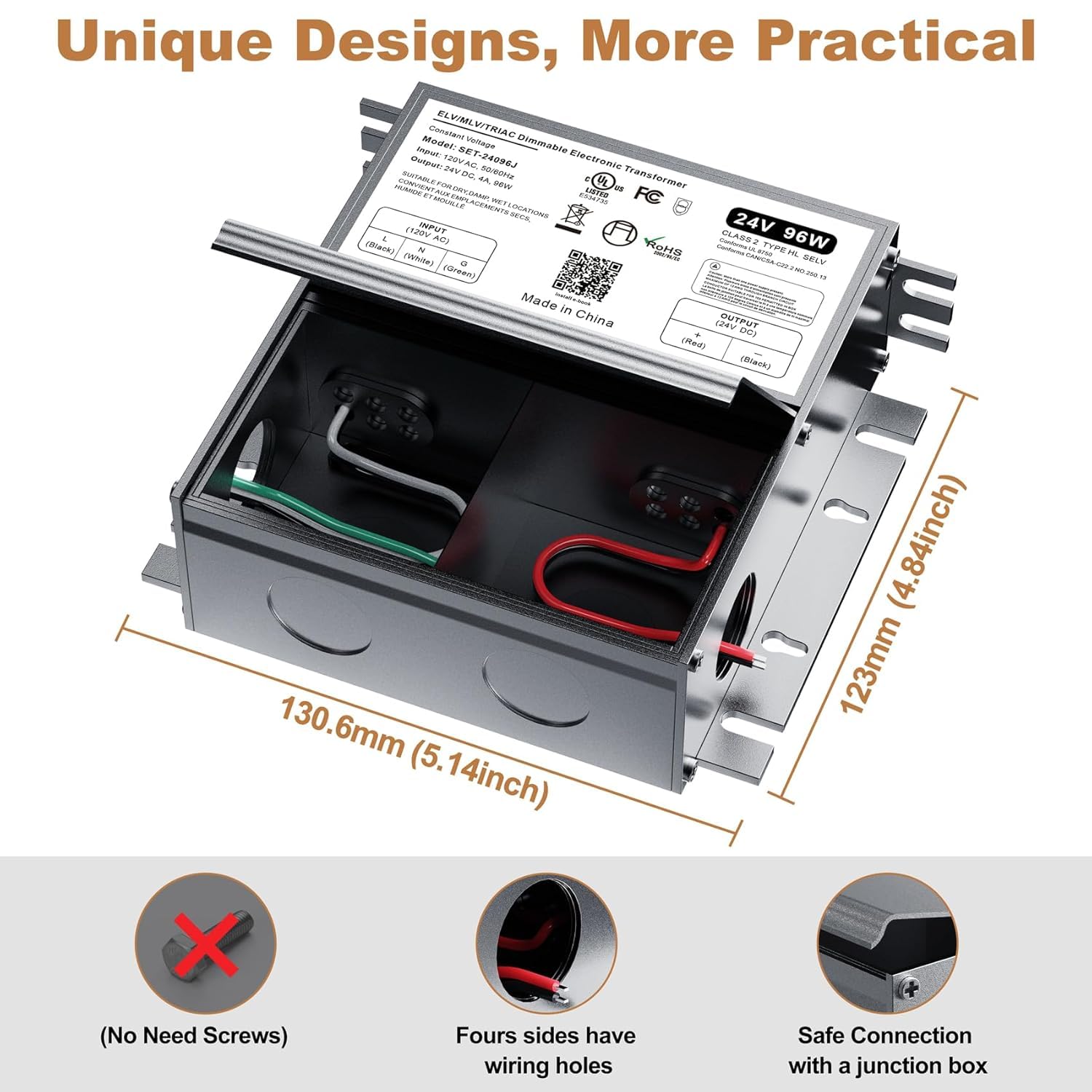 - Safety & High quality dimming: Our 24V 96W dimmable transformer is one of the safest transformers on the market. Designed with full protection metal case, for dry, damp, wet location. Built-in protections include Short Circuit/Over Loading/ Over Temperature protection. Its cooling system prevents overheating and fire hazards, and with no buzzing noise, you can enjoy worry-free dimming for your LED lights.