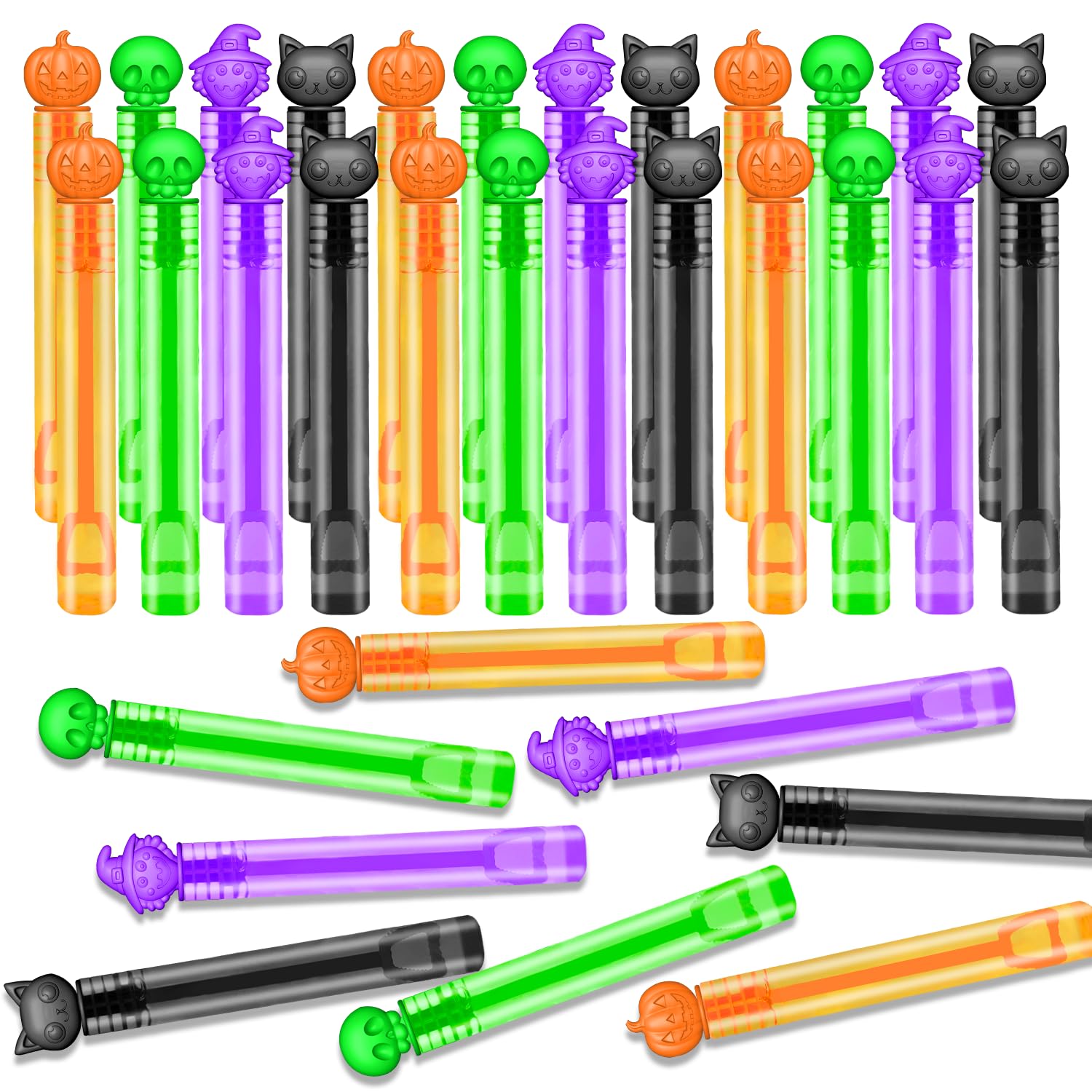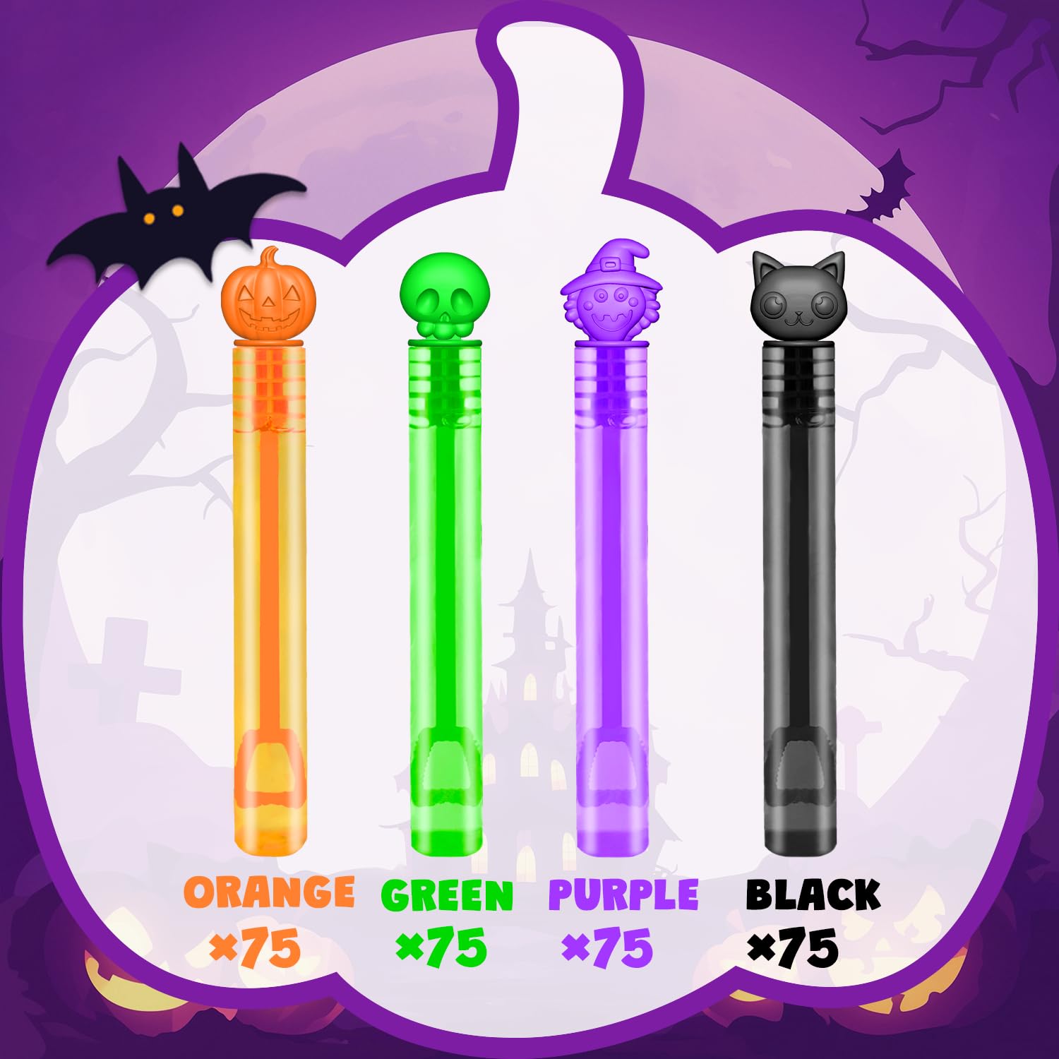 - 300 Pack Mini Bubbles - Includes 4 bright colors and fun Halloween designs like pumpkins, witches, skulls, and black cats. These bubble wands bring festive cheer and seasonal delight to kids' playtime.