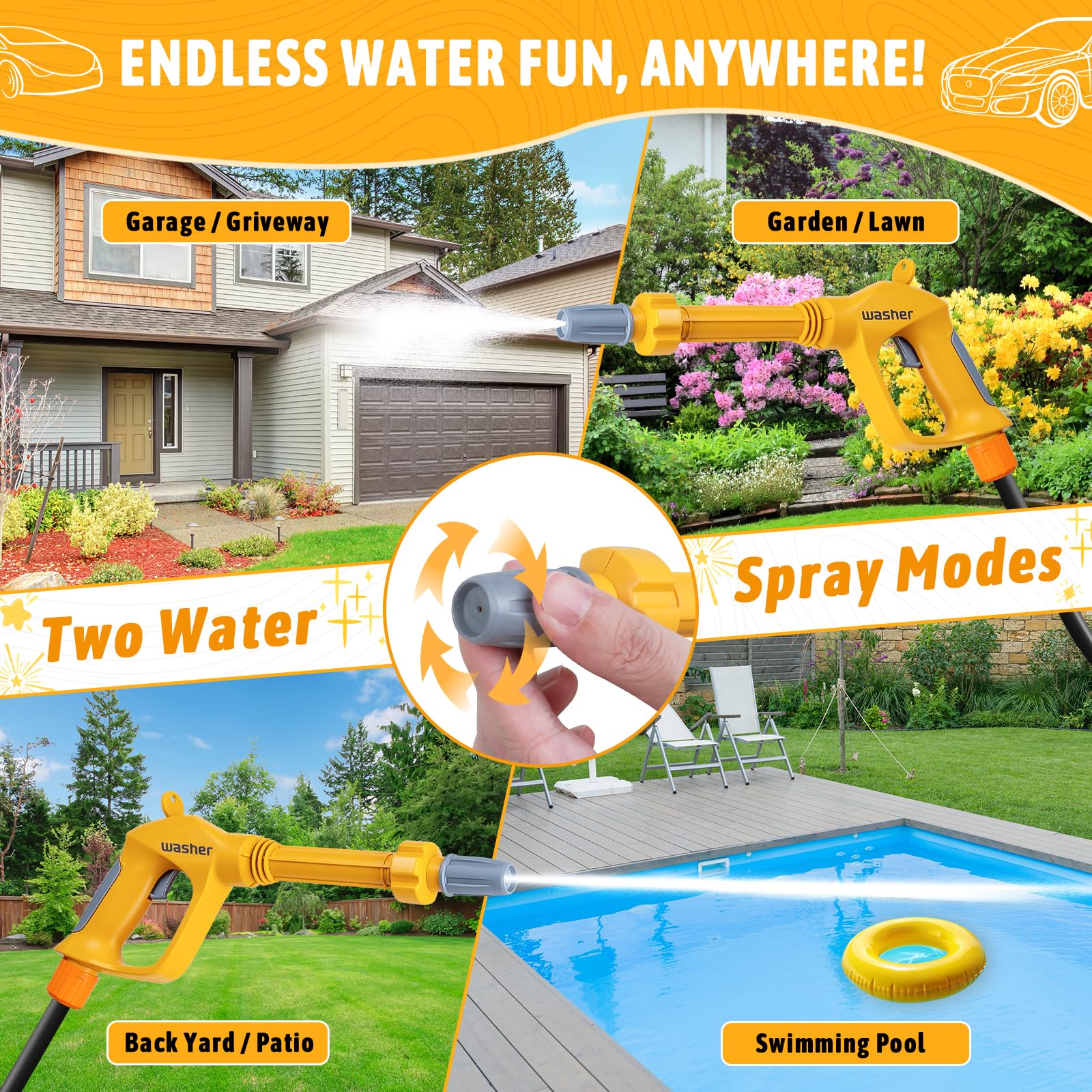 - đŚEndless Water Fun, Anywhere! â Featuring a realistic pressure washer design, this spray gun has a functional switch valve and two adjustable spray modes. Kids can have a blast playing with water, washing cars, or even watering plantsâturning any garden, back yard, patio, lawn, swimming pool, garage or driveway into a fun-filled adventure zone.