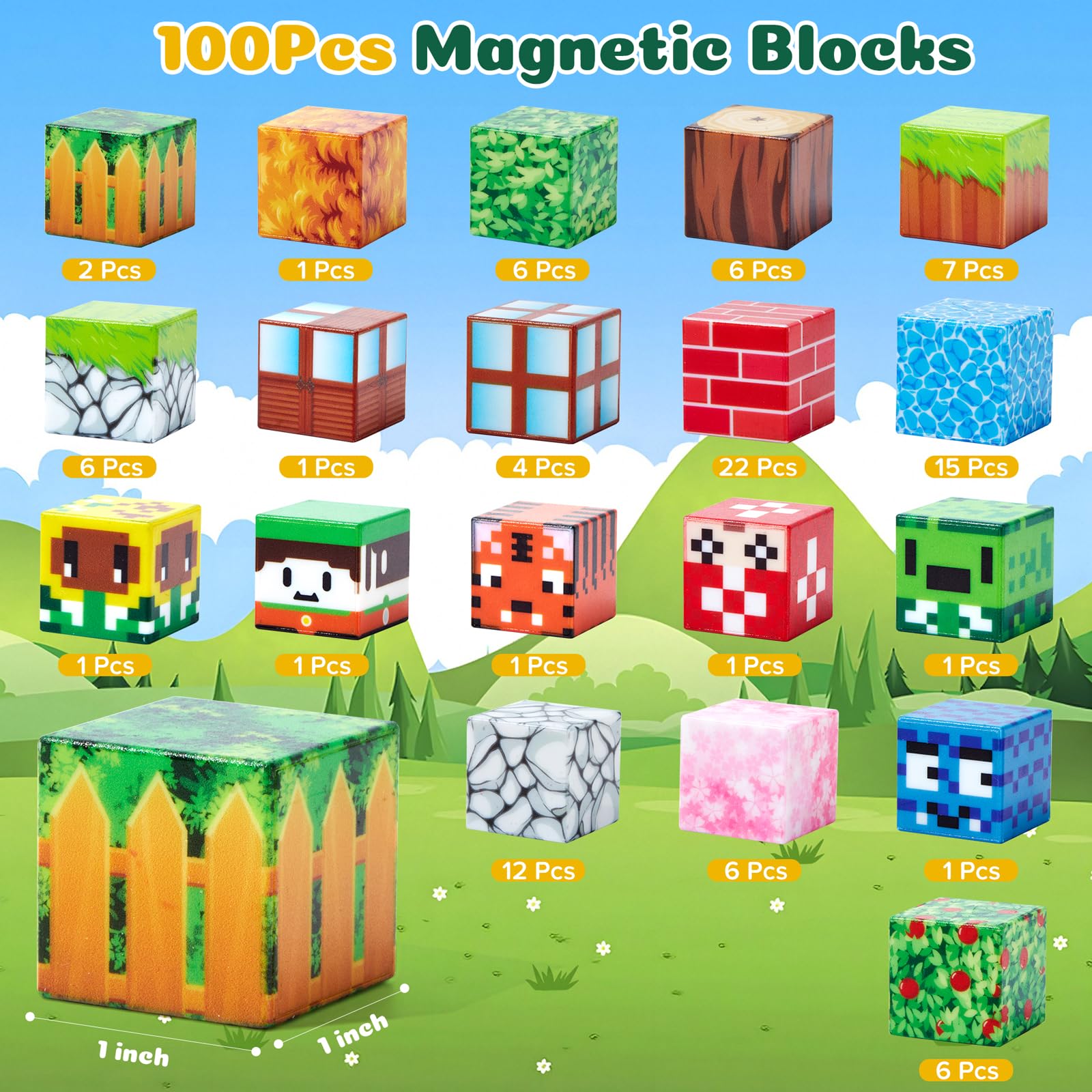 Magnetic Blocks, 100 PCS Magnetic Building Blocks, Forest Theme 1-Inch STEM Constructions Magnet Blocks for Boys Girls Ages 3+, Educational Sensory Stacking Toys for Kids Christmas Birthday Gifts