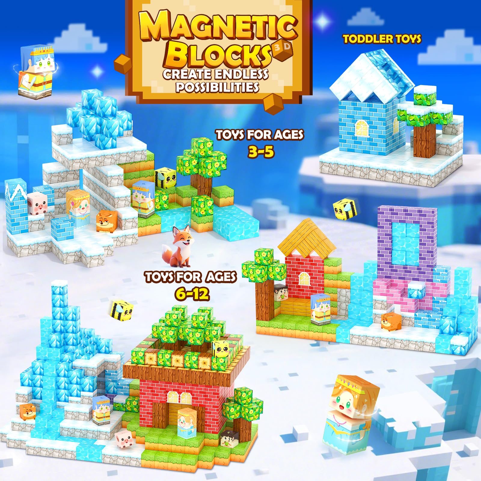 - EXPLORE TWO EXCITING WORLDS: The 150pcs magnetic blocks set includes grass, plank, water, flower, tree, castle, fox, pig, bee and diverse mini figurines. Kids can travel from a vibrant forest to an ice world through a fantastical entrance