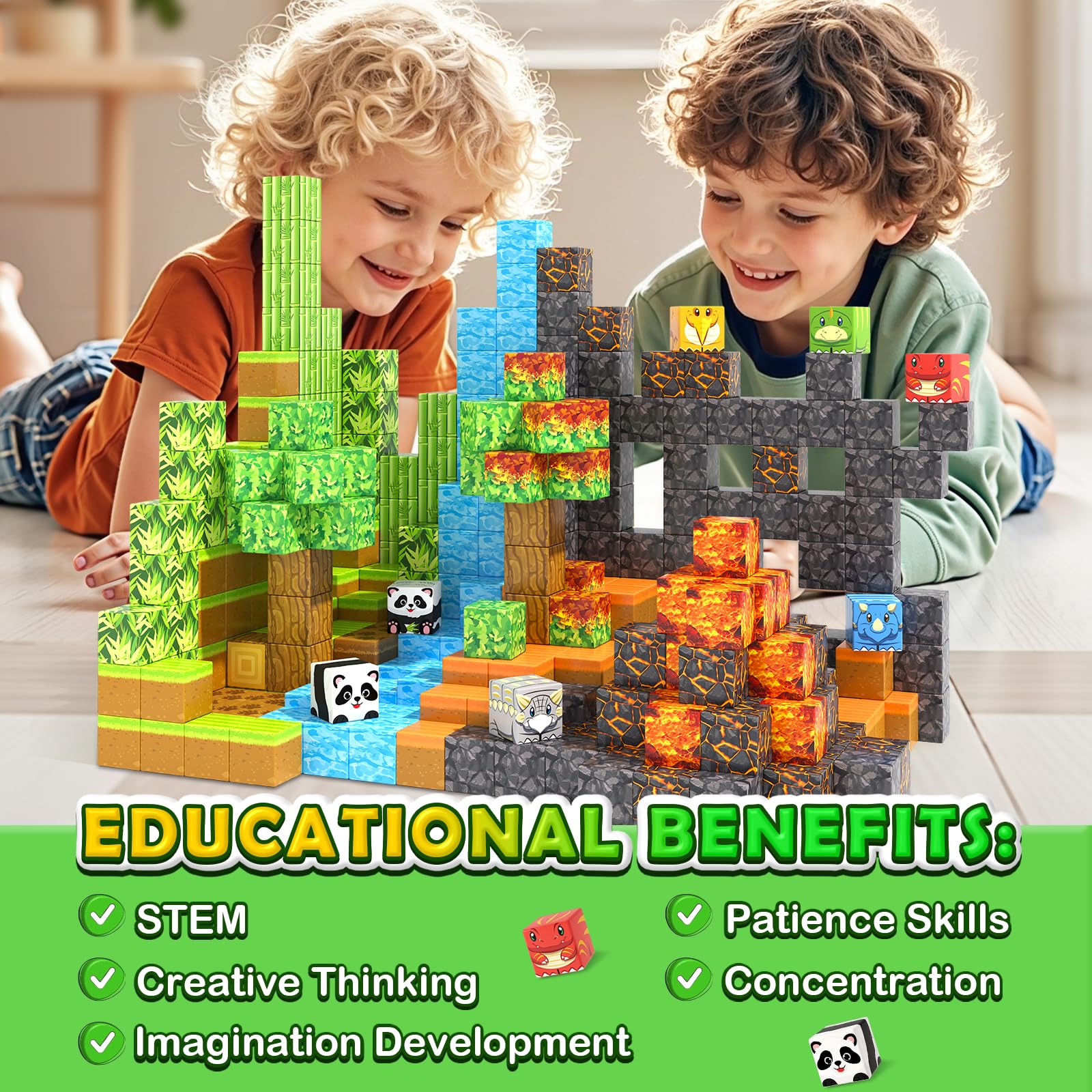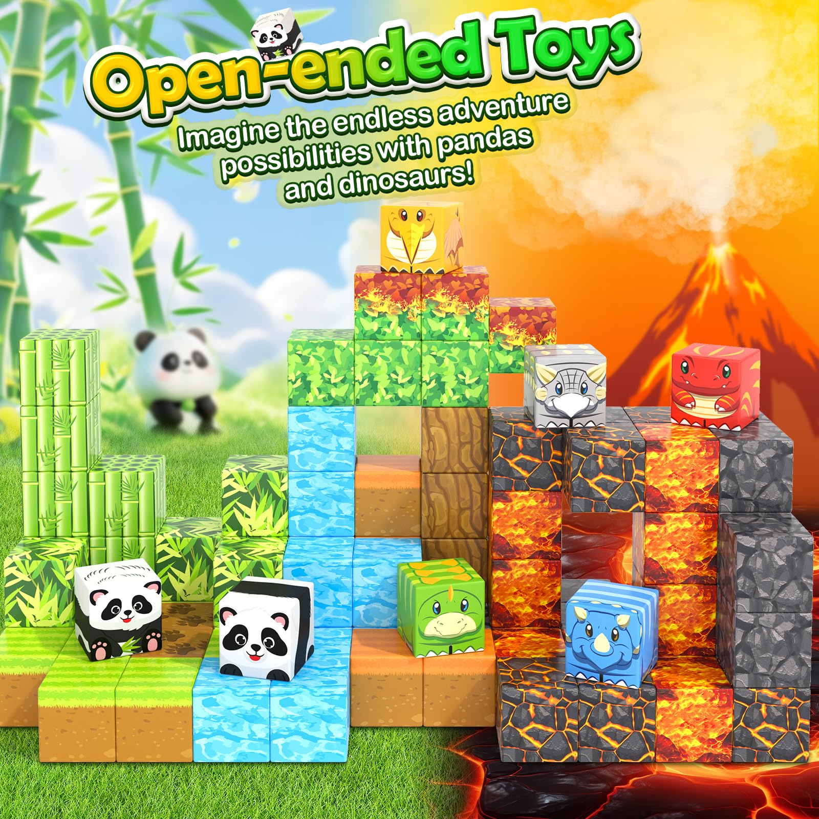 - 【COMPATIBLE OTHER MAGNETIC BUILDING BLOCKS】Dinosaur Panda building blocks designed with a 1-inch size compatible with all Mine Magnet World blocks on the market, allowing for endless expansion and creativity. Whether starting a new collection or adding to an existing one, building blocks provide kids limitless playtime possibilities, expanding kids' exploration of magic magworld map.