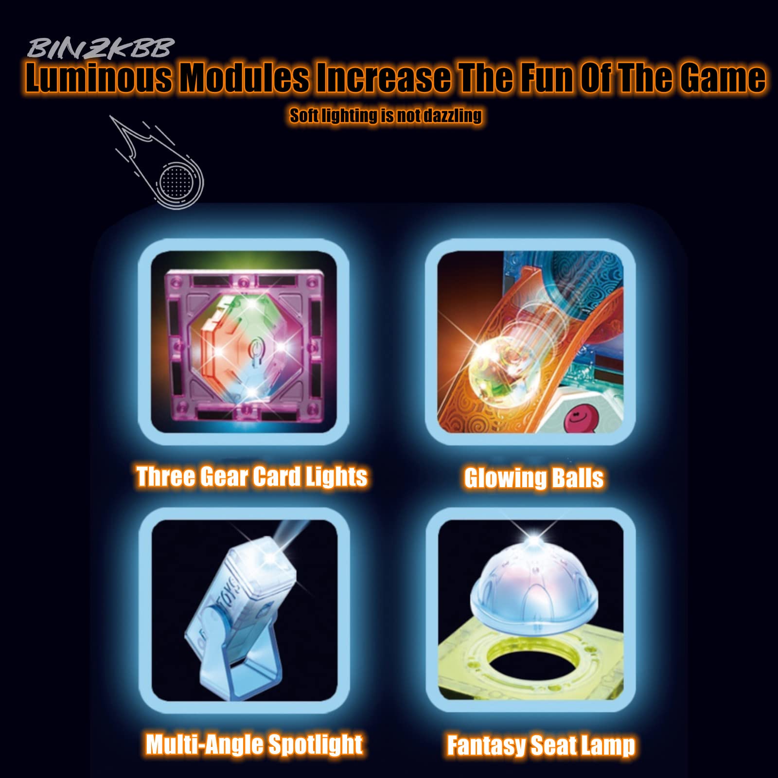 - 【Unlocking Endless Possibilities】Set contains 144 pieces with a variety of LED lights, 10 different geometric shapes provide endless building possibilities. Includes a centrifugal funnel, a three-way pipe, a ramp and a U-turn. Use the creative shapes and pieces to develop a sense of logic, and the motion-activated LED light-up balls emit colorful light as they pass through the tiles, capturing children's attention and maximizing the fun of construction play.Add more pieces as needed and combine with other BINZKBB magnetic tiles to build tracks and mazes of any size.