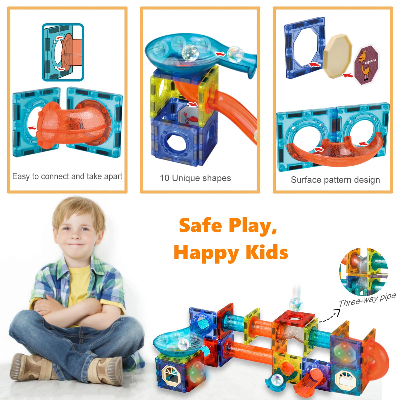 - 【Advanced Magnet Tiles Race Track】We prioritize safety. Our BINZKBB premium blocks are tested to ensure quality and safety. These high quality blocks are made of BPA-free child-safe lead-free material, durable ABS plastic. Magnetic blocks are designed with rounded edges and smooth edges to protect your child's small hands. Ultrasonic welding process anti-throw test prevents them from breaking. Creates a safe environment for your child's playtime.