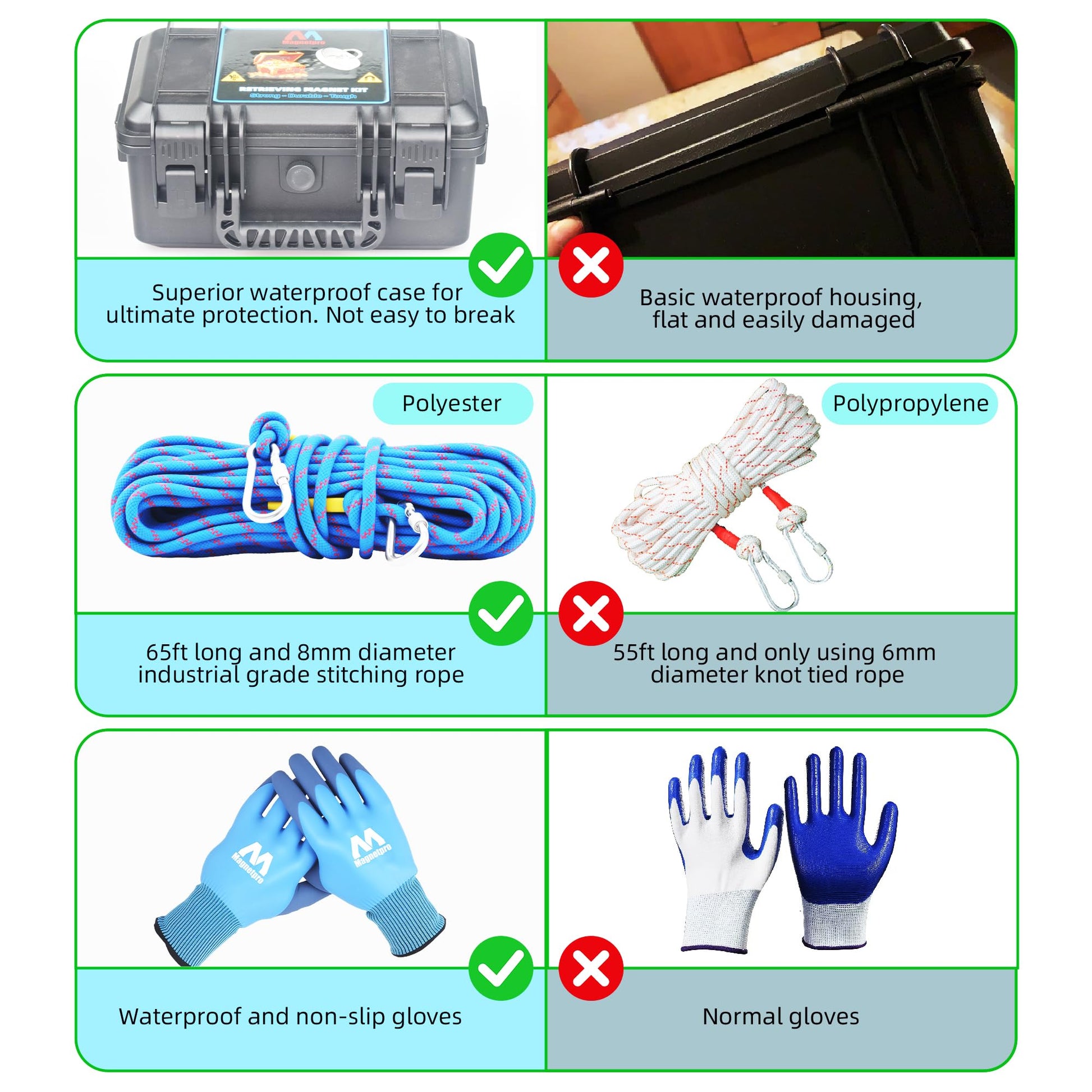 - ✔️Complete Set for All Skill Levels - Whether you're new to magnet fishing or a seasoned pro, this all-in-one kit is designed to offer ease of use, featuring a waterproof drop-resistant storage case, waterproof cut-resistant non-slip gloves, and threadlocker to ensure safe and successful adventures!