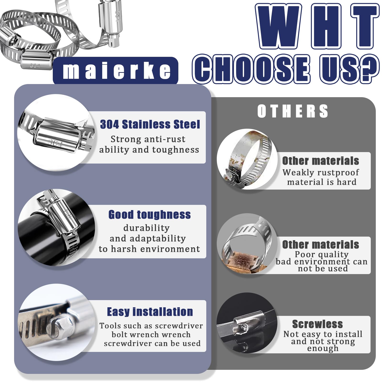 - Excellent Material:maierke hose clamp is made of 304 stainless steel, with a thickness of 0.023 inches, smooth edges, good-looking and durable. Stainless steel hose clamp is corrosion-resistant and rust-proof, and can be used in harsh environment