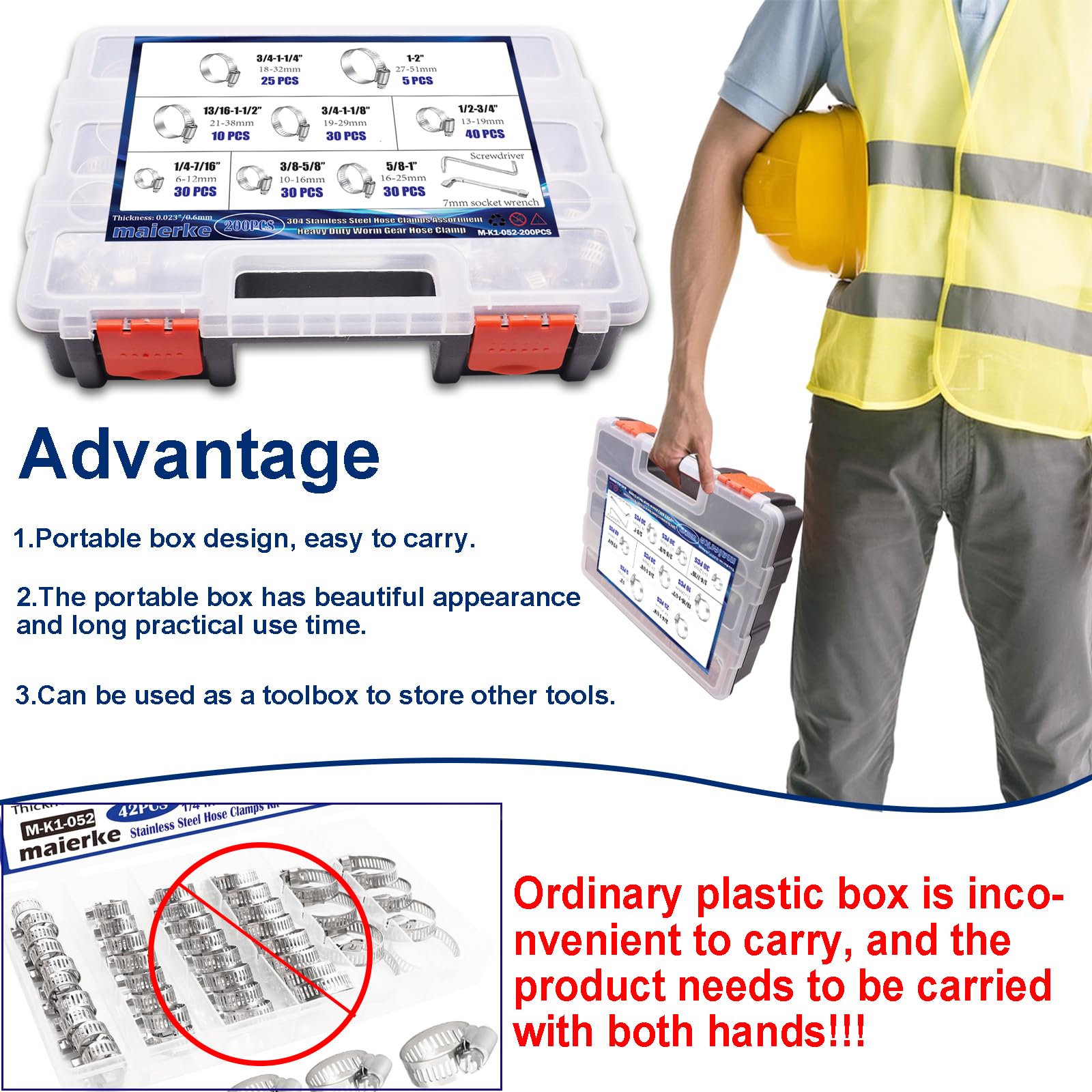 maierke 200PCS Stainless Steel Hose Clamps Assortment Kit,Metal Adjustable 1/4"-2"(6-51mm) Worm Gear Hose Clamp Heavy Duty Small Hose Clamps for Automotive,Radiator Pipe,Plumbing,Fuel Line