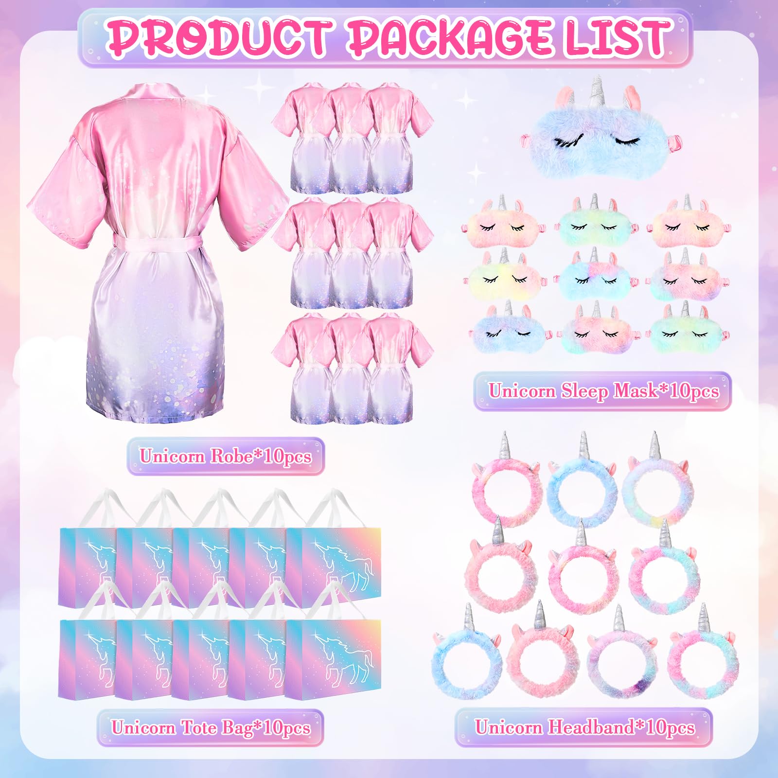 - Package Includes: our unicorn spa party supplies set includes 10 unicorn robes, 10 unicorn spa headbands, 10 unicorn eye masks, and 10 unicorn tote gift bags; This is something little girls can use to enhance their experience at a unicorn themed spa party; 6 girls can enjoy the party set at the same time, adding fun to the party