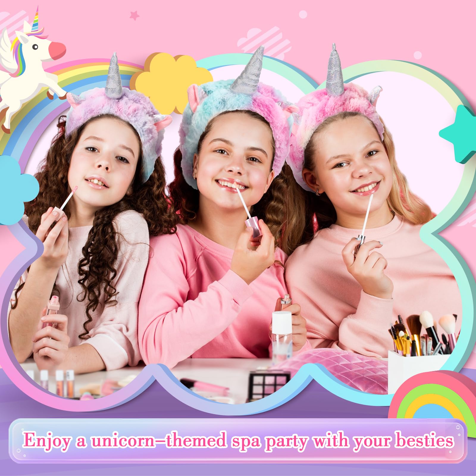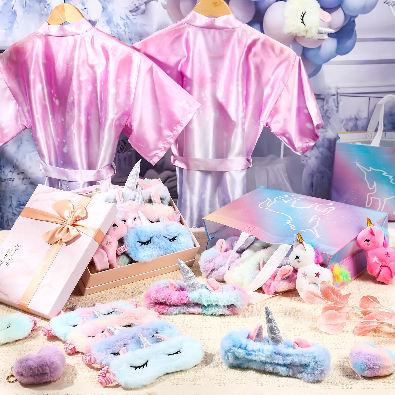 - Unicorn Theme: our unicorn sleepover party sets provide fun for hosting parties including Christmas, birthdays, Halloween, sleepovers and spa parties; This set has a vibrant unicorn theme and features a colorful unicorn robe, headband, and eye mask to create a magical, dreamy atmosphere