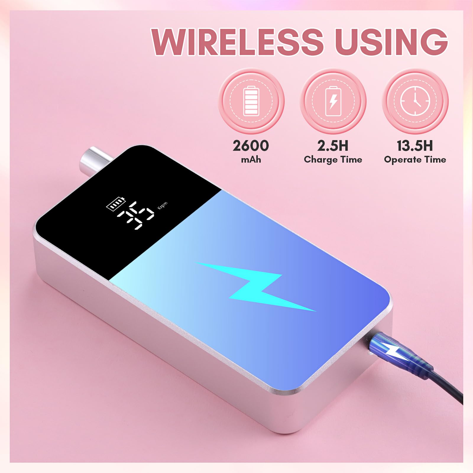 - Rechargeable & Long-Lasting: With a 2600mAh large battery capacity, and a super long standby time, Makartt electric nail drill file could be used for over 13 hours with only 2.5 hours of charge. All operation statuses in real-time will be displayed on the smart LCD screen, including the speed RPM and the battery status. Freedom to work in any place even if there is not an electrical outlet.