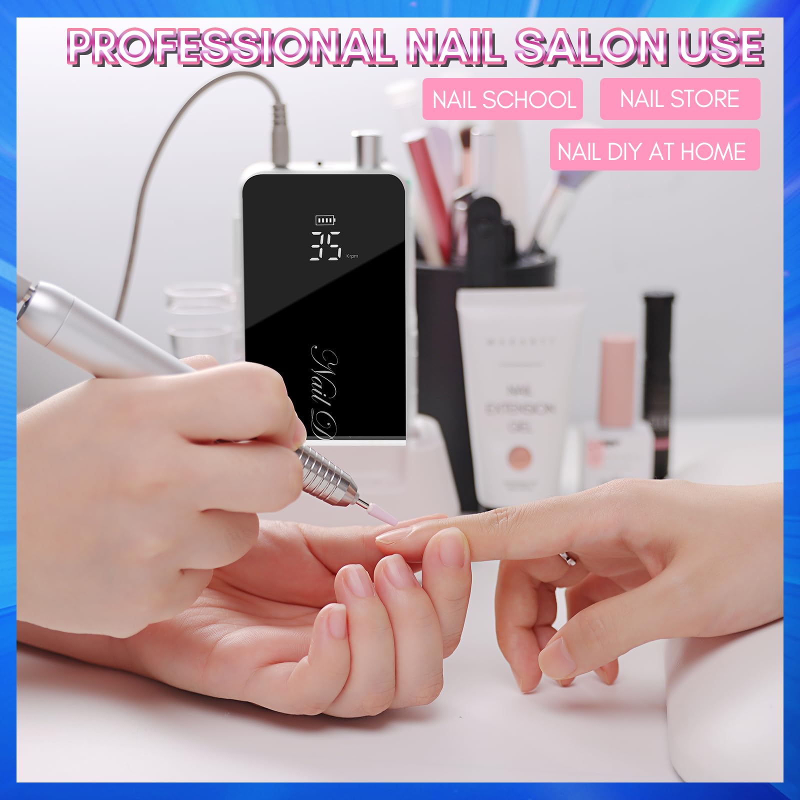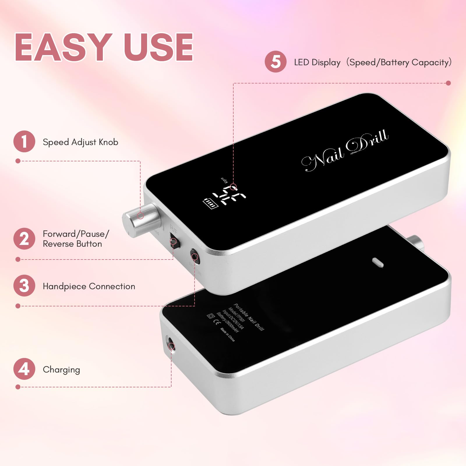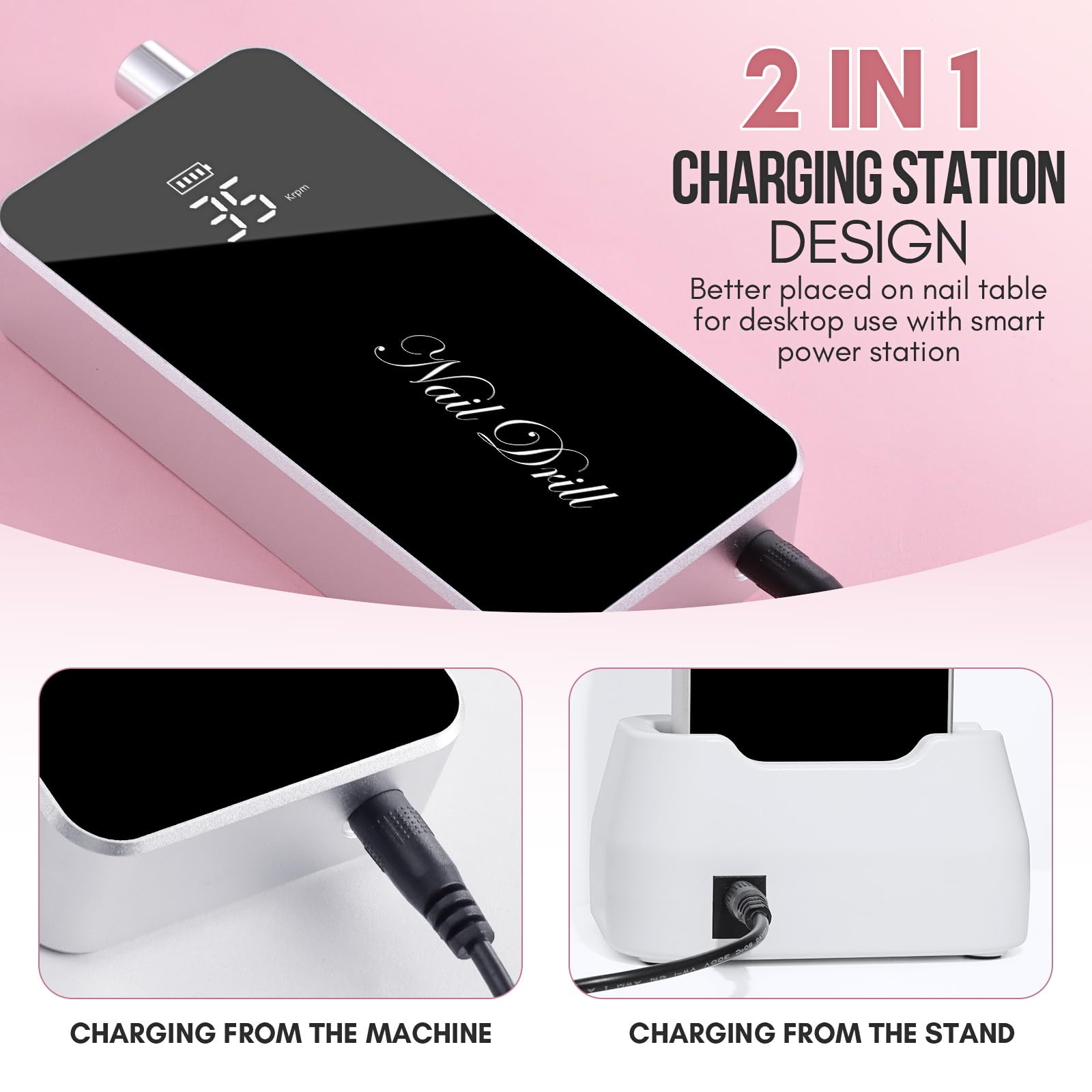 - 2 IN 1 Desktop & Portable Efile Nail Drill: This nail drill kit comes with a smart charge desktop base which you could place on the desktop and charge it while working. This cordless nail drill is designed with a removable transparent protective shell, convenient to use at the nail salon or at home.
