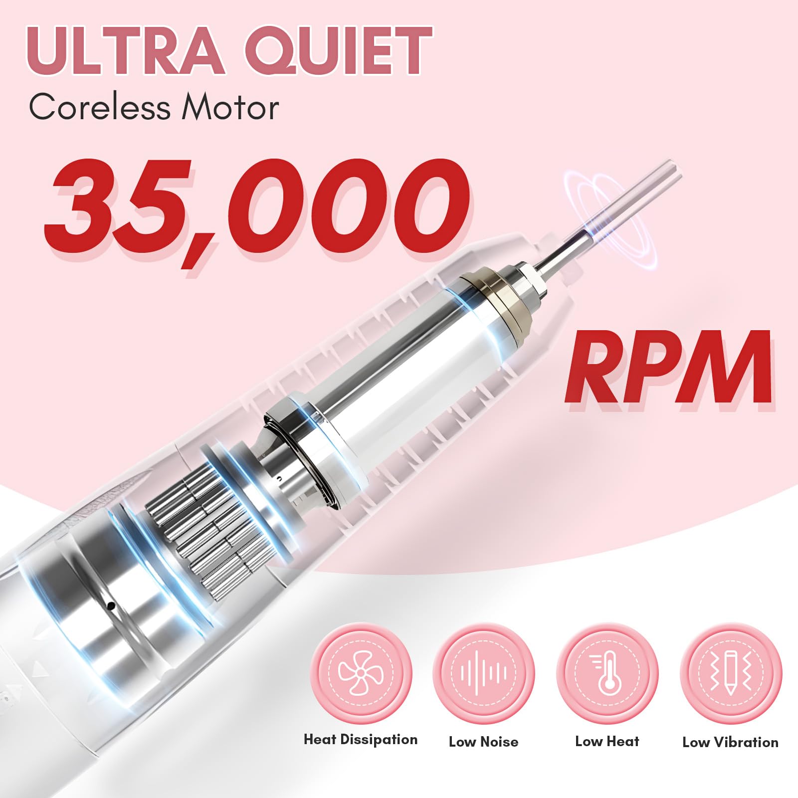 - Upgrade Electric Nail Drill From Makartt: Made of Coreless Motor with 35000 RPM high-torque, Nouvella acrylic nail drill machine has super low vibration, low noise, low heat, high stability, and long service life features. Perfect for professional nail masters and nail tech lovers to use for improving the efficiency of nail art design.