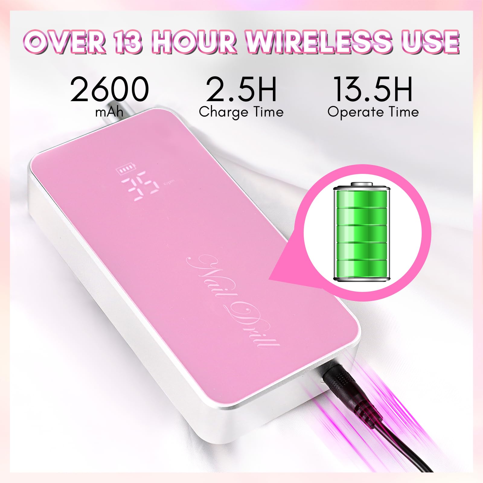 - Rechargeable & Long-Lasting: With a 2600mAh large battery capacity, and a super long standby time, Nouvella electric file could be used for over 13 hours with only 2.5 hours of charge. All operation statuses in real-time will be displayed on the smart LCD screen, including the speed RPM and the battery status. Freedom to work in any place even if there is not an electrical outlet.