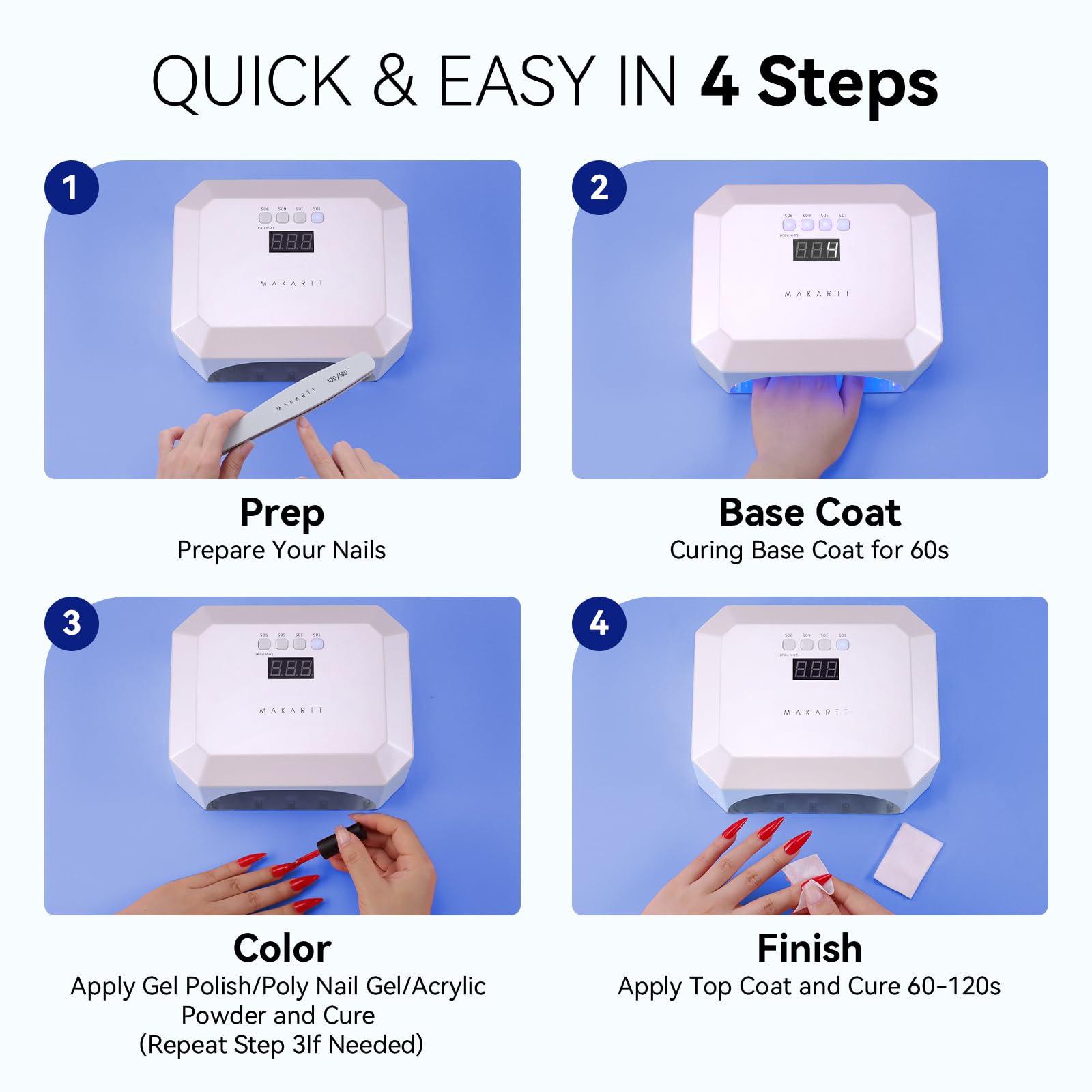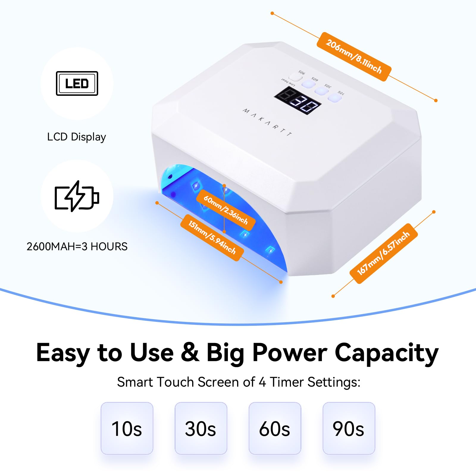 - Smart Sensor & 4 Timer Setting: Makartt nail lamps for gel polish is designed with auto infrared sensor. Hand in, light on; Hand out, light off. The 10s/30s/60s/90s timing setting with precise LCD digit display provides you with different time curing experiences in different nail styles.