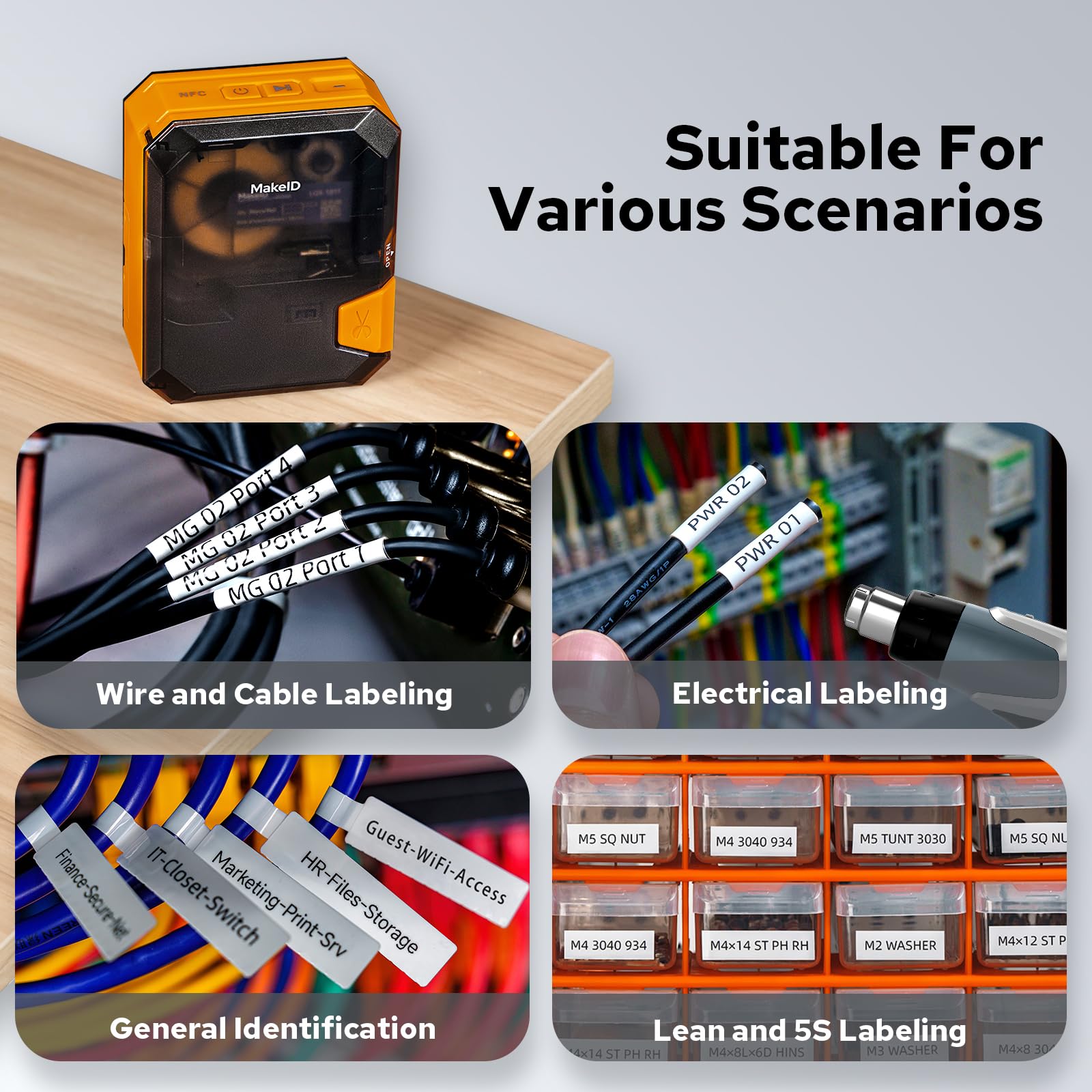 - Professional Industrial Label Maker - Offers up to 20 label sizes, including self-laminating, nylon, PET all-weather tapes, and heat shrink tubing, with new materials in continuous development. A 300 dpi resolution performs crystal-clear printing texts . With a 1-inch print head that prints up to 8 lines of text, it doubles the information capacity.