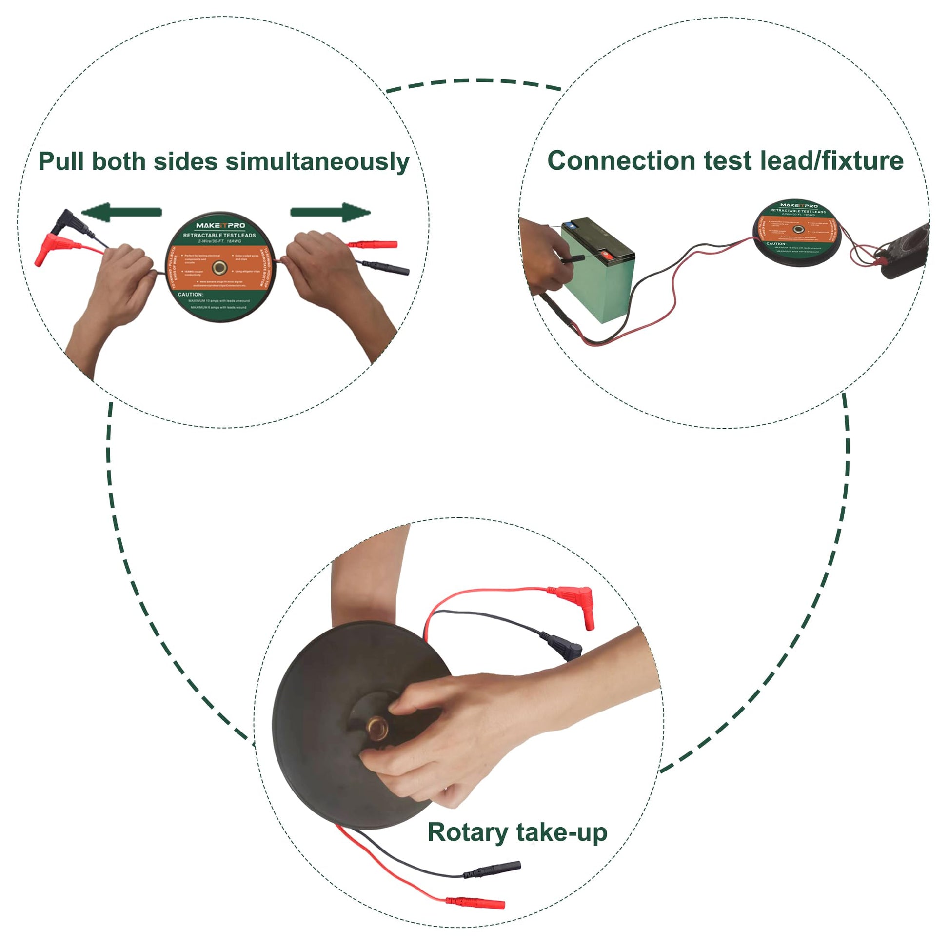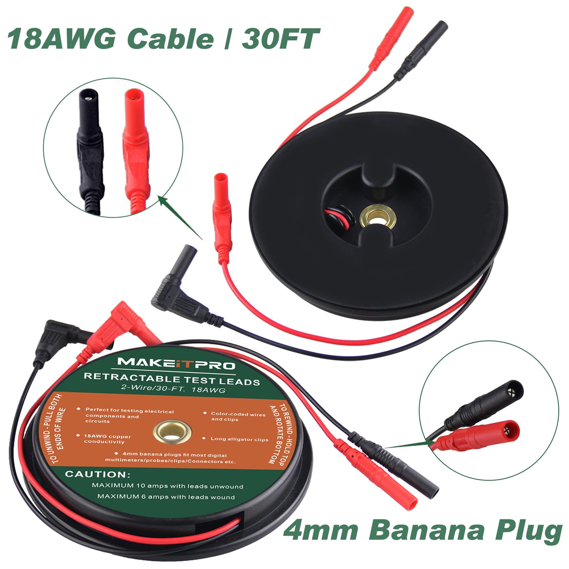 - [Retractable Test Leads] 2 wires (red and black) 18 AWG / 30 FT length for each copper wire. Pull out and stay at desired length, rewind test leads into its own protective case when not in use for storage. Used for testing electrical circuits in cars, trailers, boats, and more. High-quality copper wires with low resistance of this electrician test leads ensure sensitive and accurate results.