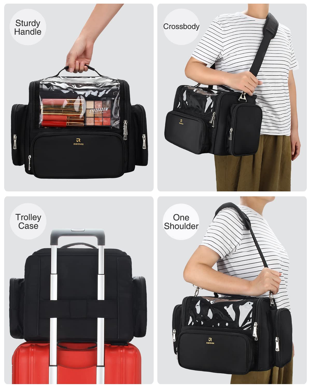 Makeup Brush Bag, Clear Makeup Brush Holder with Lid, Extra Large Capacity Travel Cosmetic Bag Makeup Artist Must Haves, Black Makeup Case, Make Up Organizers and Storage, with Adjustable Dividers