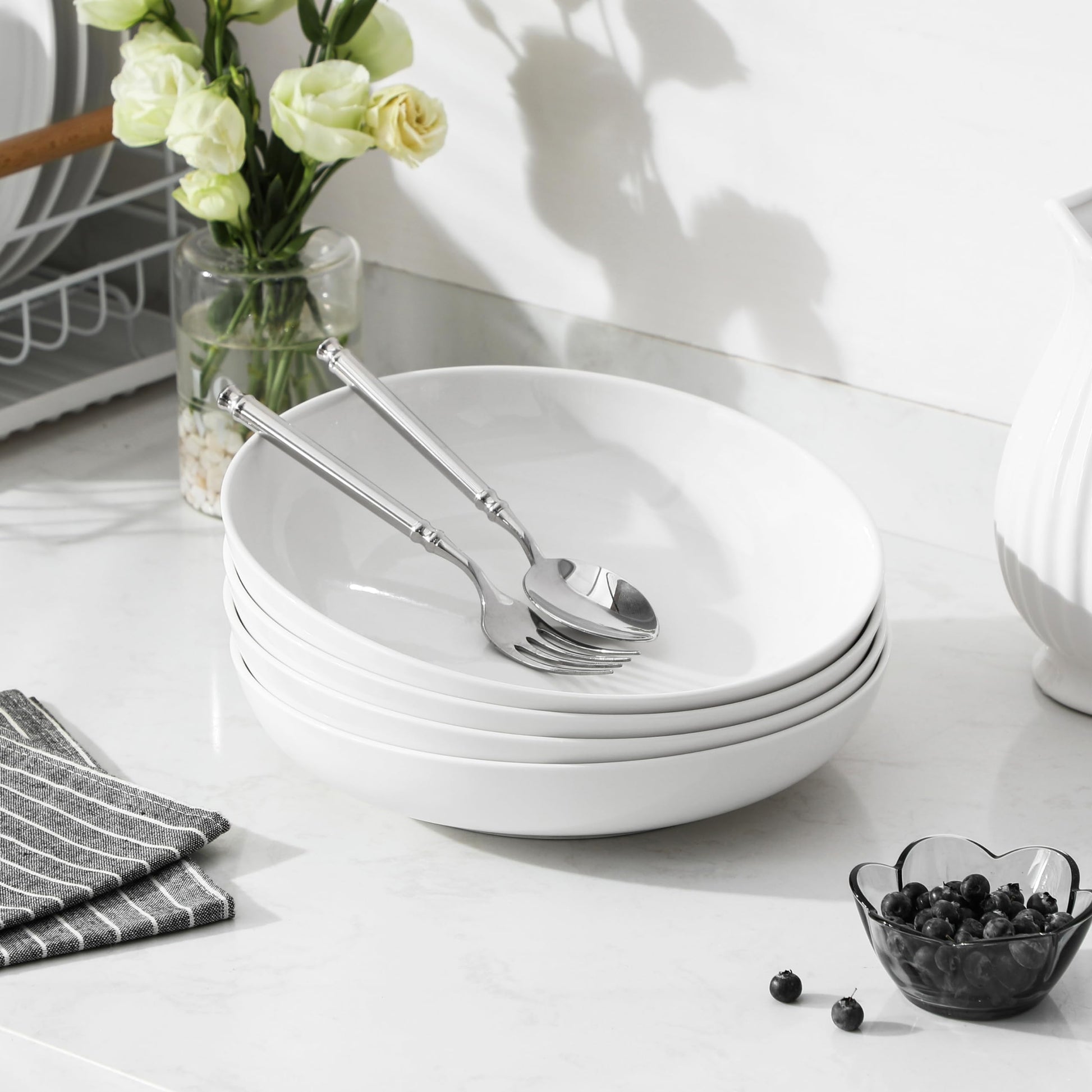 - 【WIDE & SHALLOW DESIGN】White Pasta Bowls featuring a wide and shallow design prevents spills and messes. Featuring a modern and minimalist design with a classic white finish and smooth glaze, these bowls complement any table setting and enhance dining experience.
