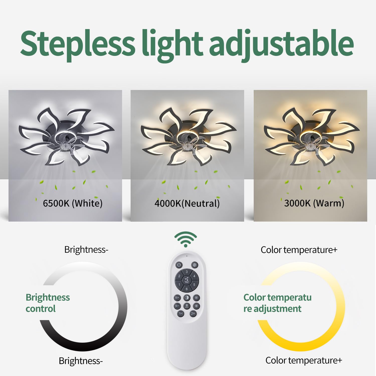 - đăCeiling Fan with Dimmable LightăThe black flush mount ceiling fan with 3 Colors dimmable light, Support stepless dimming. The Indoor ceiling fan lights has 110 voltage output and brightness from 10%-100% with 3500LM, stepless color temperature from warm(3000K) to white(6500K) and light memory function.
