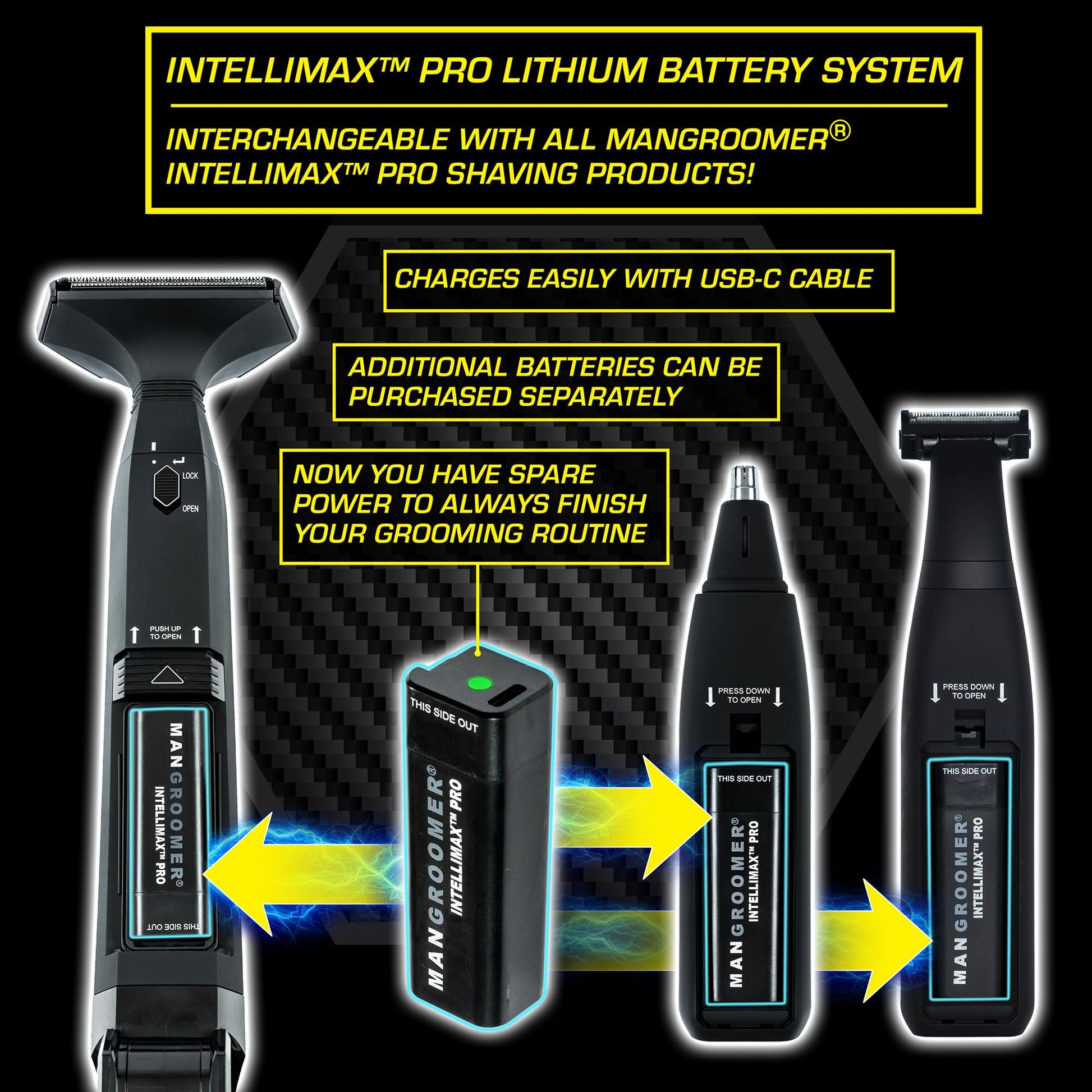- REVOLUTIONARY POWER WITH THE ALL-NEW USB-C RECHARGEABLE INTELLIMAX PRO LITHIUM BATTERY SYSTEM: Equipped with the latest USB-C rechargeable INTELLIMAX PRO Lithium Battery, this system offers enhanced reliability and seamless integration across all MANGROOMER INTELLIMAX PRO men’s grooming products. The battery is interchangeable, allowing you to easily swap between devices. For added convenience, additional batteries can be purchased separately, ensuring you always have spare power at your disposal—perfect for keeping your grooming routine uninterrupted, even during travel or extended use.