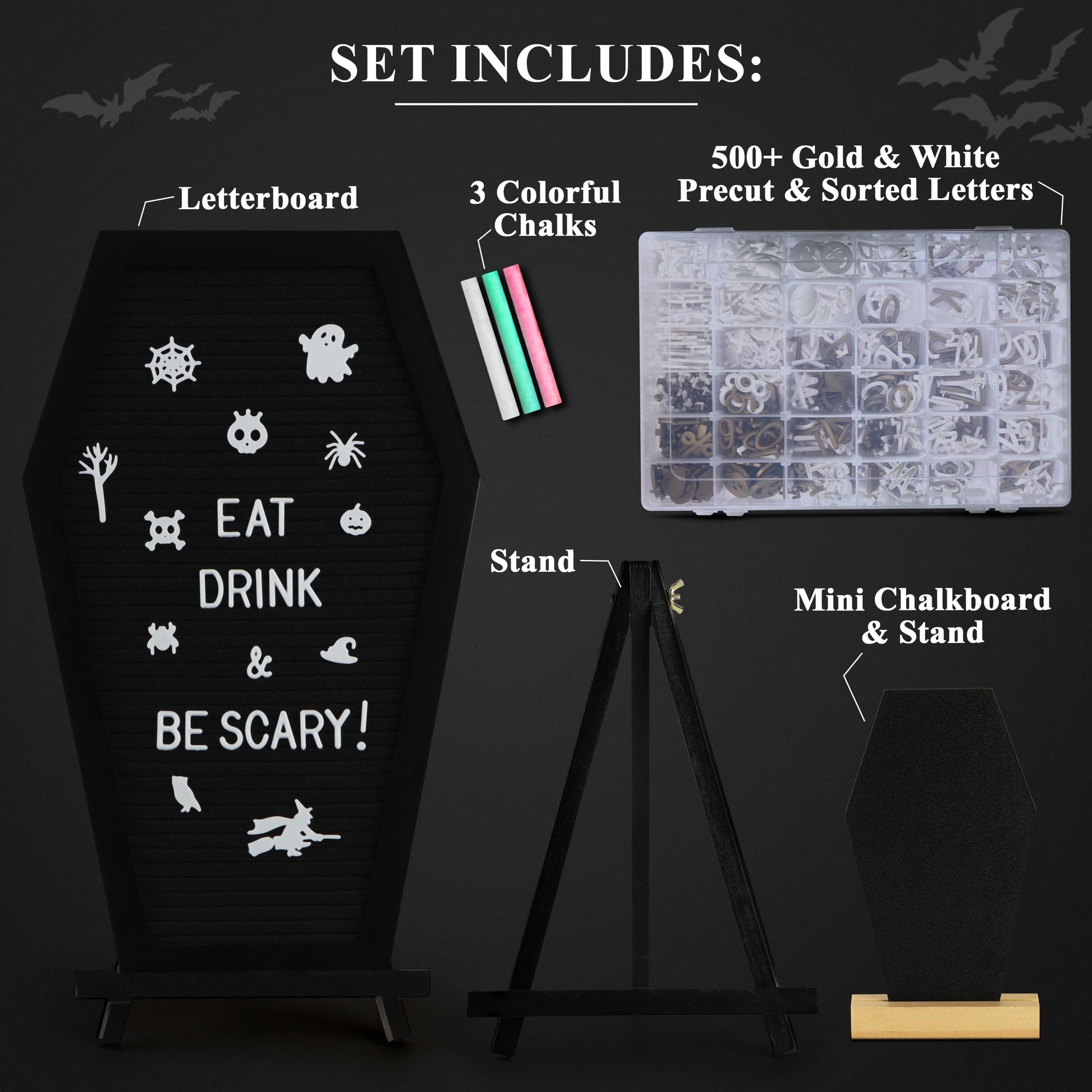- 2 In 1! Included with your coffin letterboard is a mini coffin chalk board you can use for goth decations or halloween horror decor!