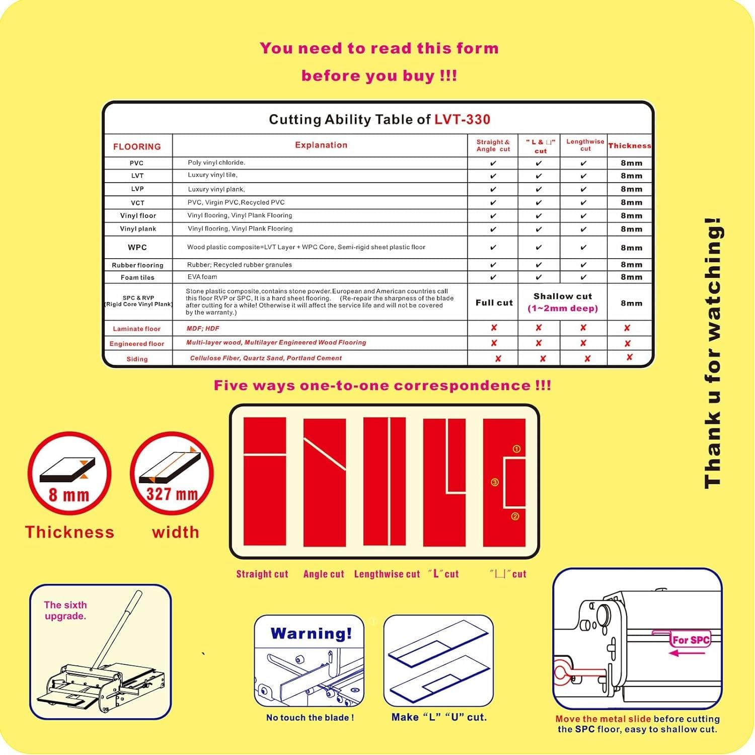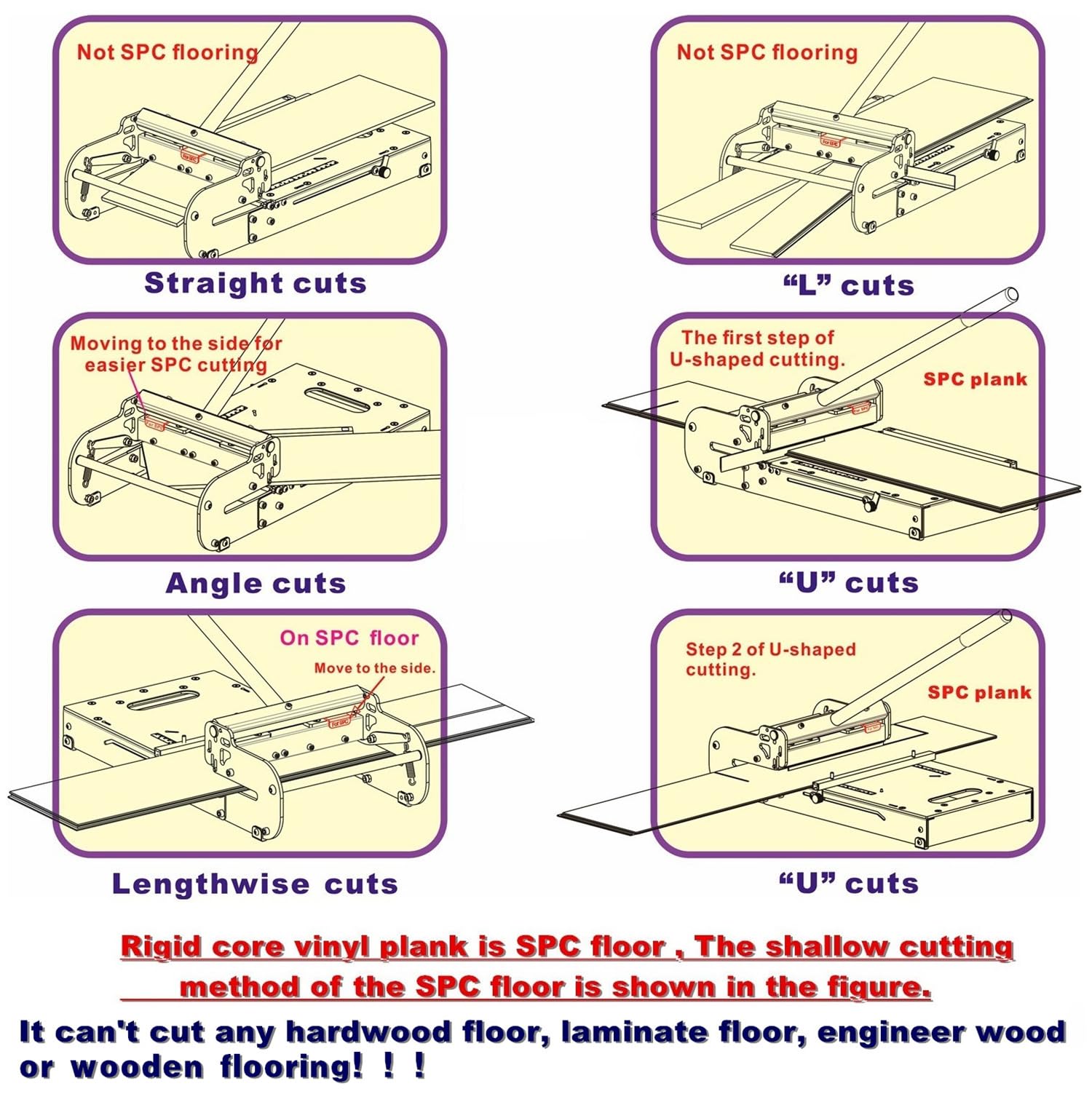 - Design for cutting LVP, WPC, SPC, LVT, VCT, PVC, Vinyl Plank Flooring. Can't cut laminate flooring and other hardwood. No dust, No noise, No electricity needed, Easy and Professional cutting vinyl plank flooring . There are spare size bars included in the instruction manual.