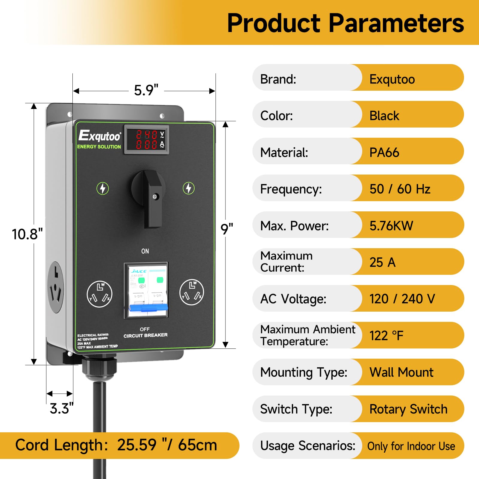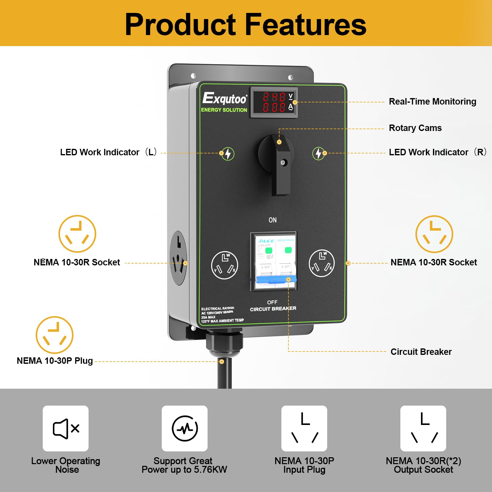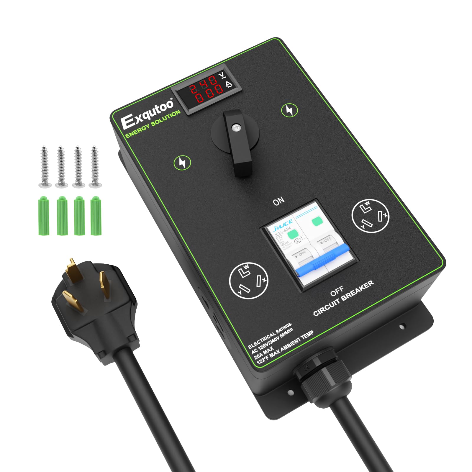 Details: Exqutoo Manual EV Charging Splitter Switch, NEMA 10-30 Dual Socket Selector, 120/240 VAC with Breaker, Real-Time Voltage & Current Display