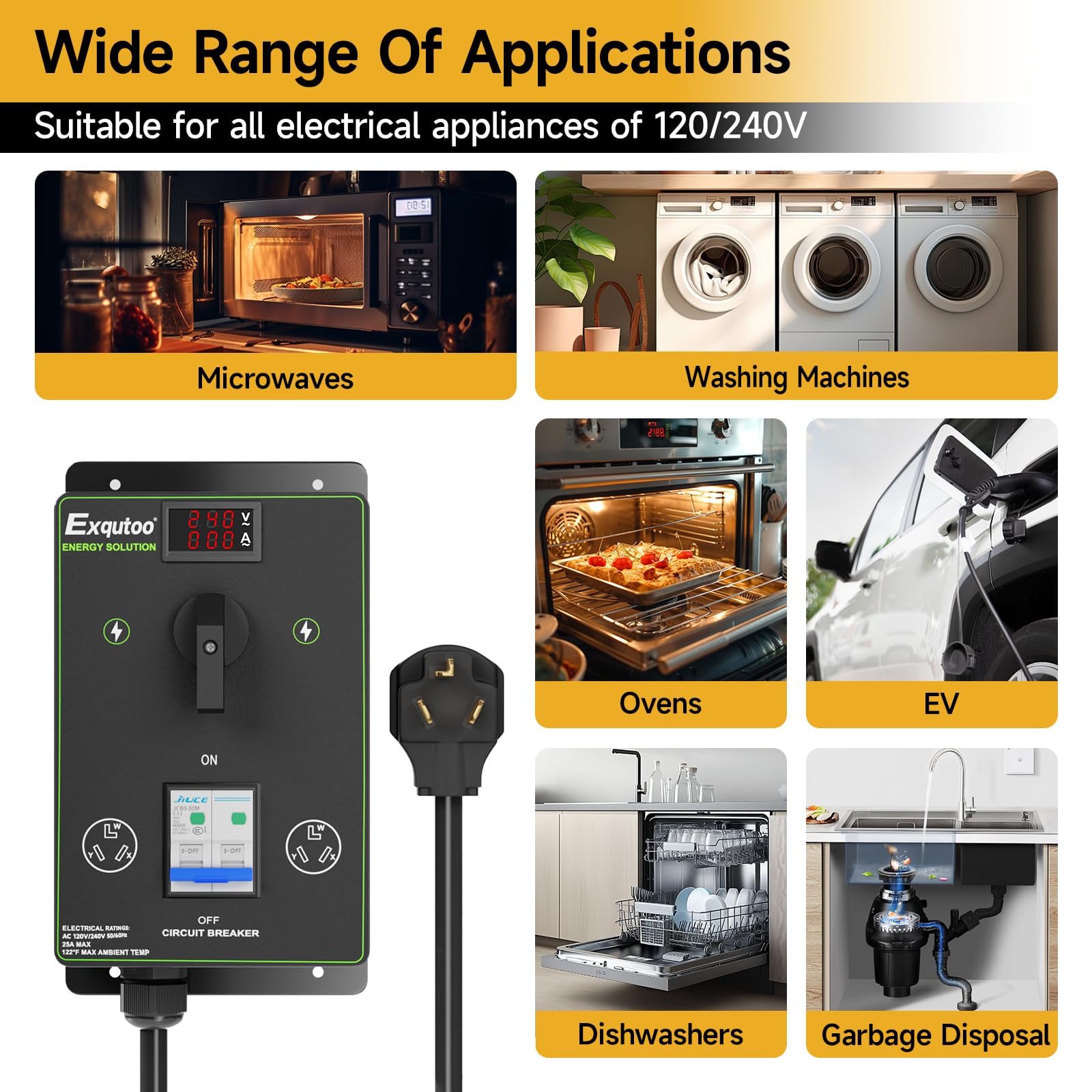 Designed with strong compatibility in mind, it features 2 charging ports that work seamlessly with all NEMA 10-30 standard outlets, making it ideal for home use. The device supports a wide range of household appliances, including dryers, electric vehicles, microwaves, dishwashers, and more, offering flexible charging options for your everyday needs.