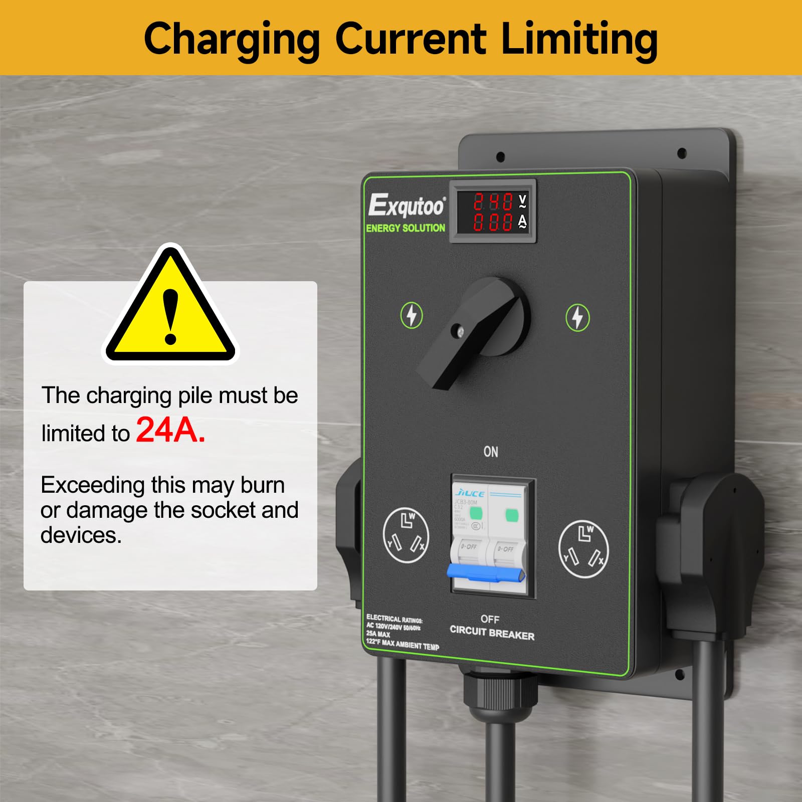 - Safety Current Limit: Ensure charging current stays BELOW 24A to prevent overheating or damage to sockets/electrical devices; Exceeding this limit may cause fire hazards or equipment failure