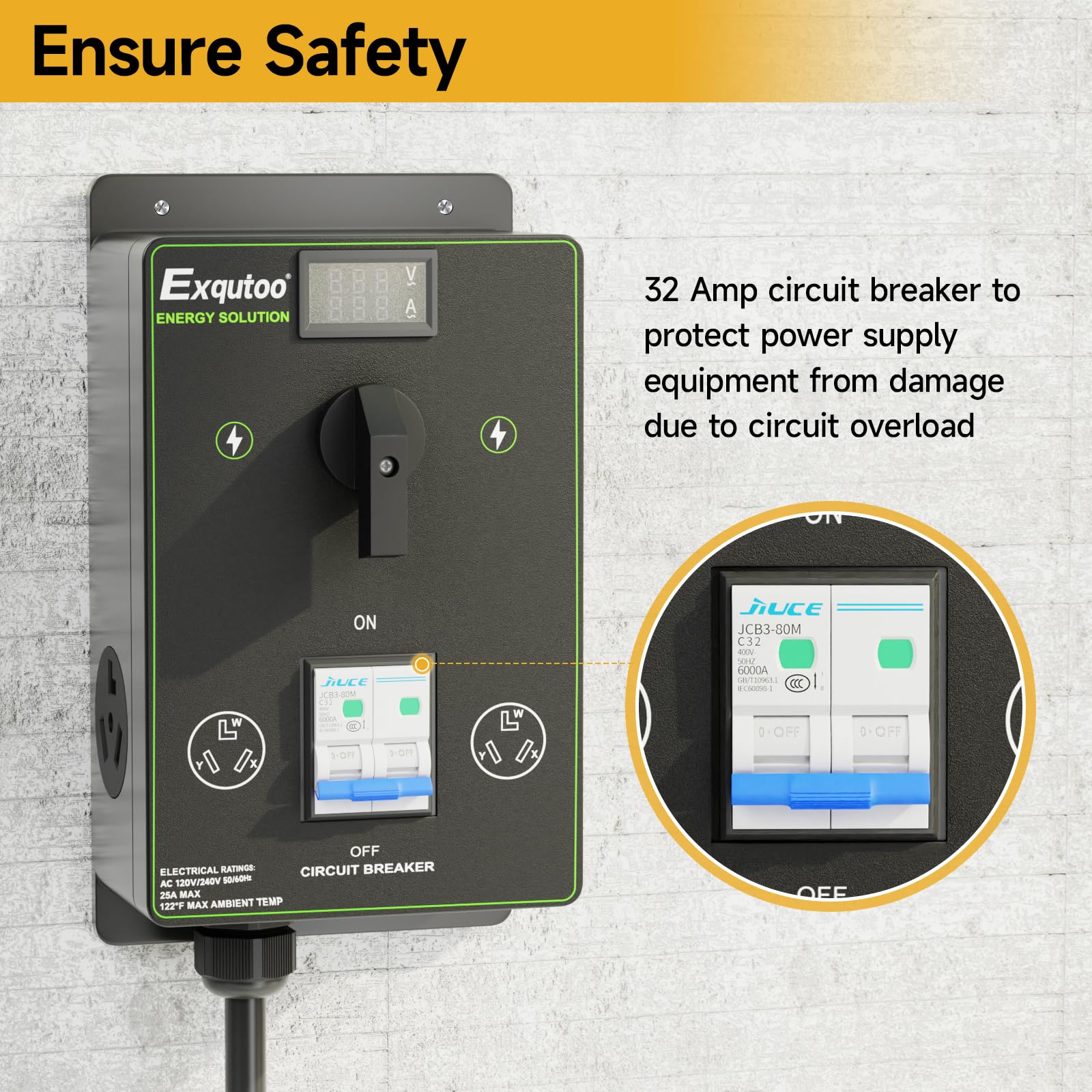 The Exqutoo manual EV charging splitter switch provides a safe, durable, and convenient solution for managing your home charging needs. Made from premium PA66 material, this switch offers superior durability and wear resistance, ensuring long-lasting performance. It is fire-retardant with a UL94 V-0 rating and includes an integrated circuit breaker for added safety, giving you peace of mind during every charge.