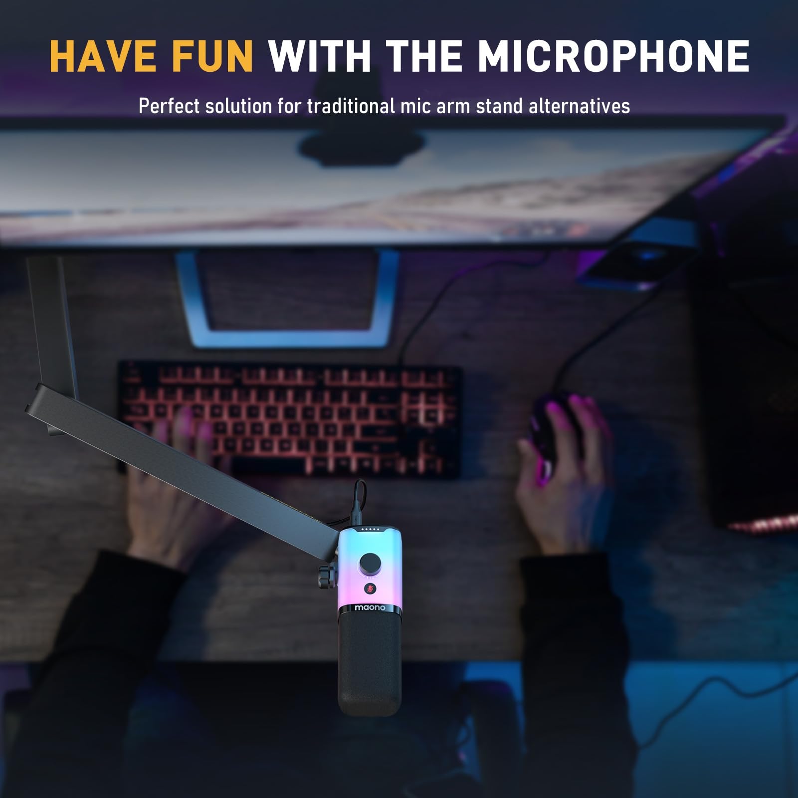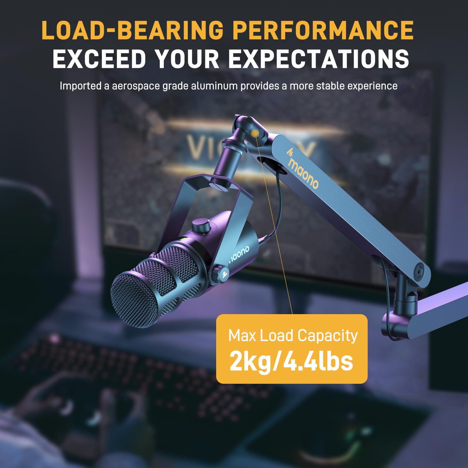 - Low Profile Microphone Boom Arm: The MAONO BA92 microphone boom arm is designed to sit low on your desk, seamlessly integrating into your workspace. It securely attaches to desktops up to 2.36" in thickness, making it perfect for broadcasting, recording, podcasting, gaming, music, and more. The heavy-duty boom end fits 3/8" or 5/8" mic threads and can support up to 4.4 lbs in weight