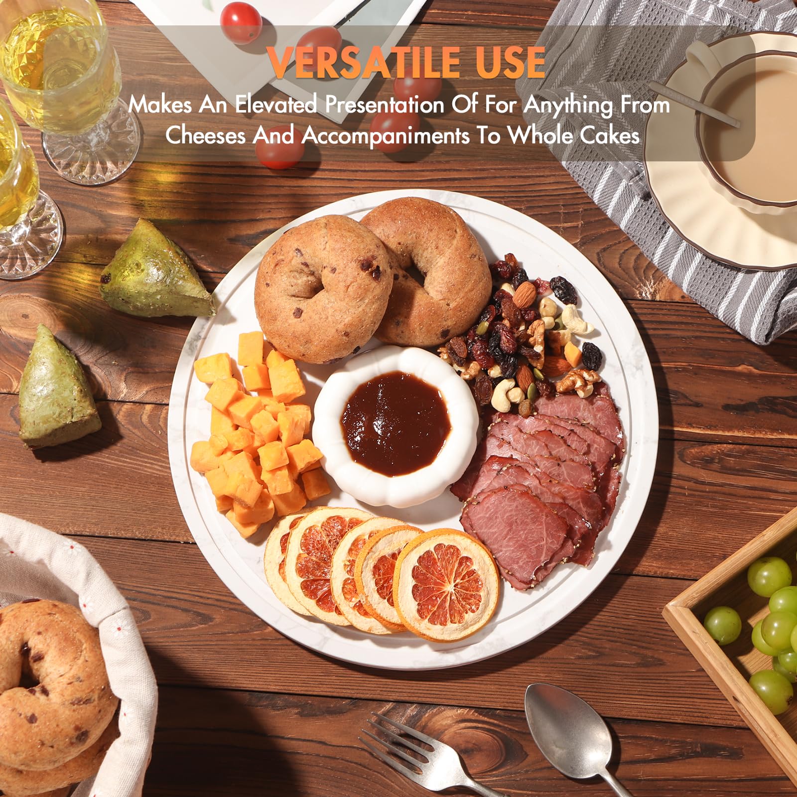 - HAND-TURNED BEAUTIFUL MARBLE BOARD---The board is handcrafted from solid and heavy duty white marble,and hand polished to a high shine,variations in the stone's natural gray veining make each stand unique,makes an elevated presentation of for anything from cheeses and accompaniments to whole cakes to hors d'oeuvres and confections.