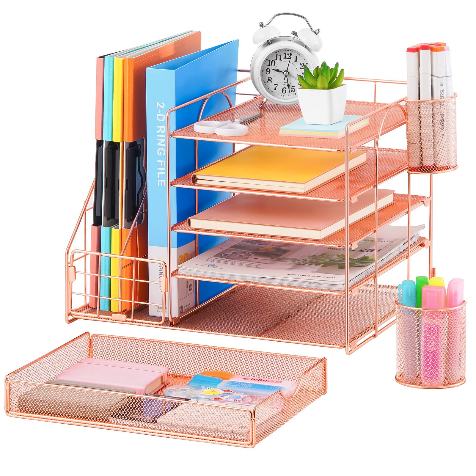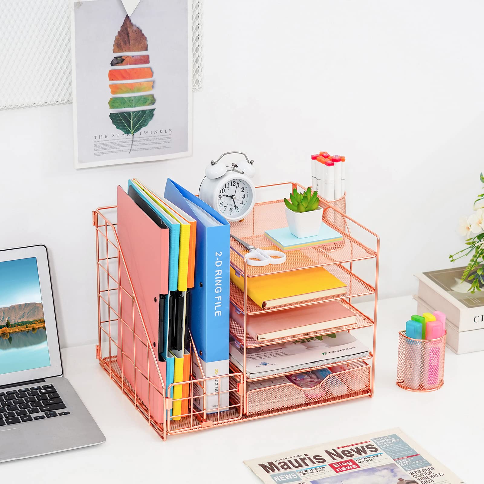 Marbrasse Rose Gold Desk Organizer with File Holder, 5-Tier Paper Letter Tray Organizer and Drawer, Mesh Desktop Storage with Magazine Holder for Office Supplies