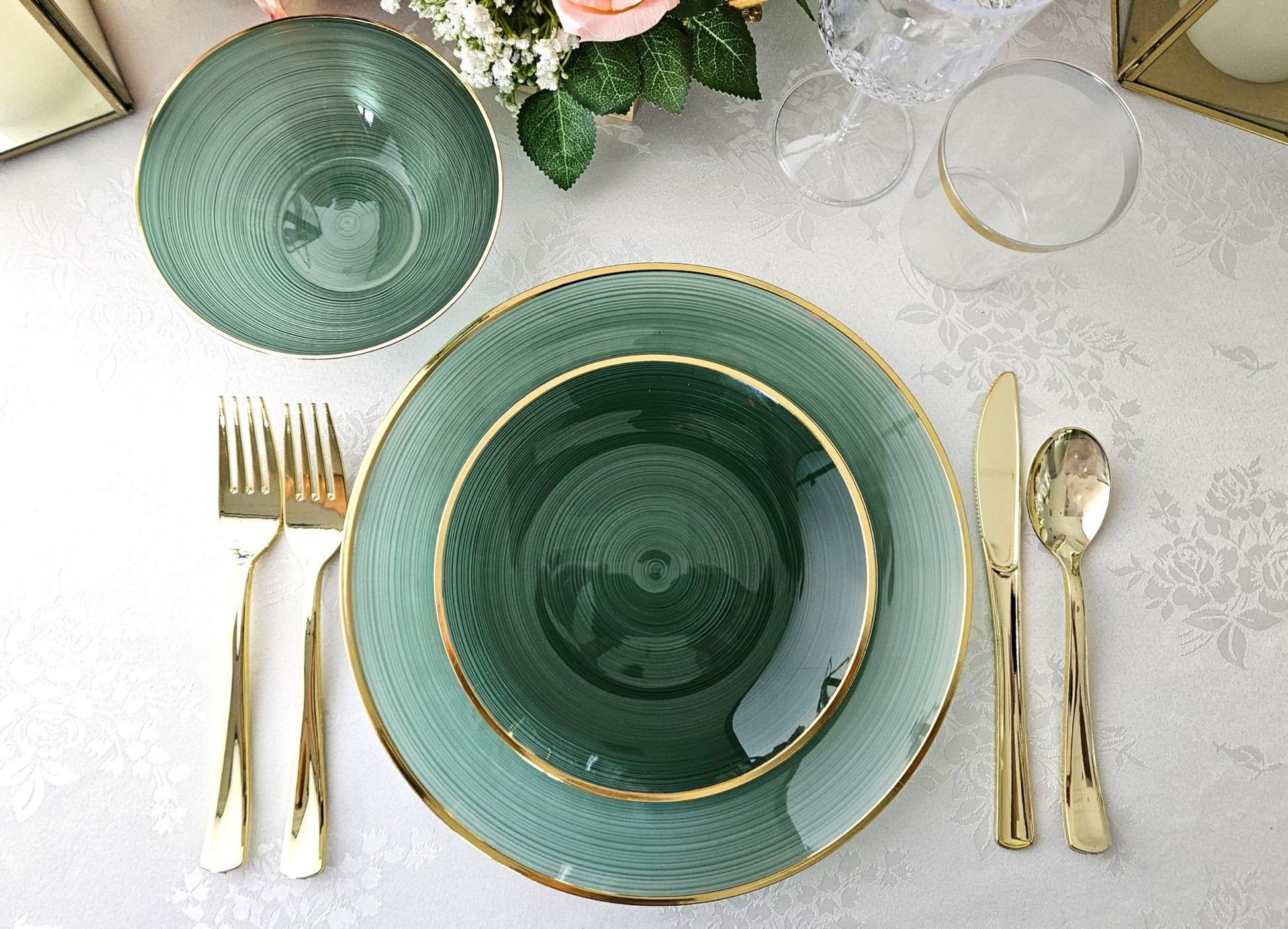 " OCCASIONS " 50 Plates Pack (25 Guests)-Wedding Party Disposable Plastic Plate Set -25 x 10'' Dinner + 25 x 7'' Salad & Dessert plates (Belize in Green & Gold)
